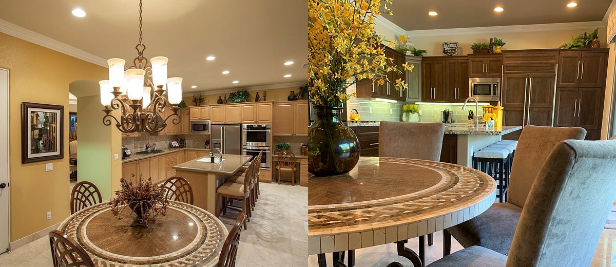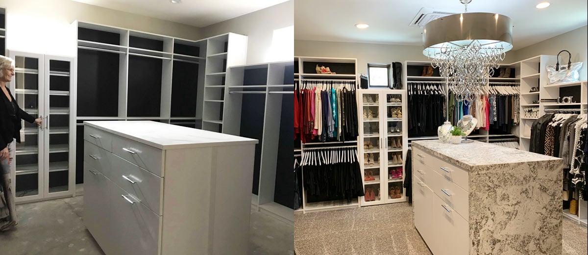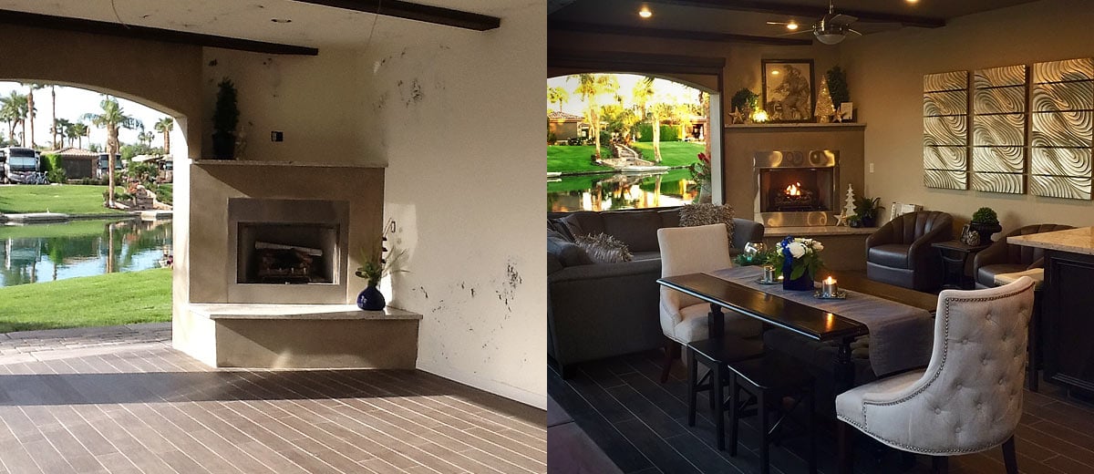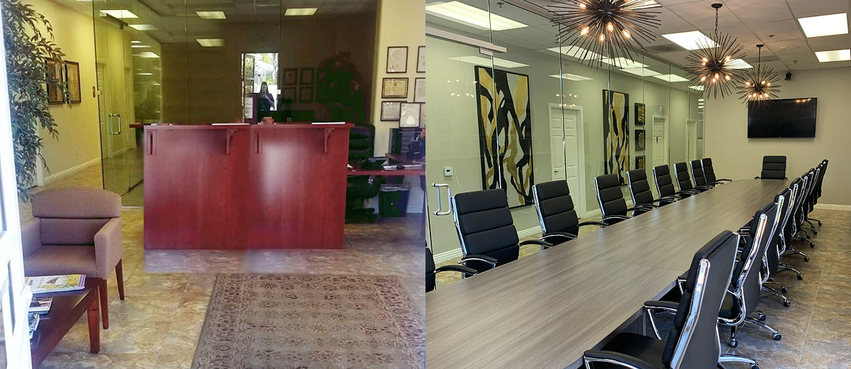 Here are a few before and after photos. 1) Honed Granite with a waterfall edge and oversized light fixture makes this closet come to life. 2) This conference room went from dated & small to modern & roomy. 3) This kitchen redesign created a better flow. Updated cabinets, countertops and hood gave this tuscan kitchen an updated look. 4)Flood damage made it necessary to replace cabinets and drywall, so we did some small color changes while we were there. 5) This new construction indoor/outdoor space in an RV park is warm and welcoming even in December.